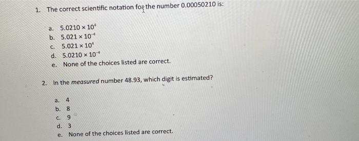 A 50210 x 104 B 5021 x10-4 C 5021 x104 D 50210 x104 E none of the. A5 102 B5000 102 C5 10-2 D500 102 Enone of the above 2 3The correct number of significant figures in the number 0027090 is. The correct scientific notation for the number 000050210 is.
